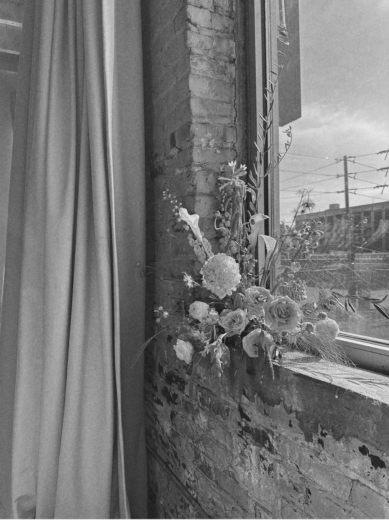 Black and white photo of a decorated table with a floral arrangement of hydrangeas and roses, lit candles, and table settings including plates, glasses, and silverware.
