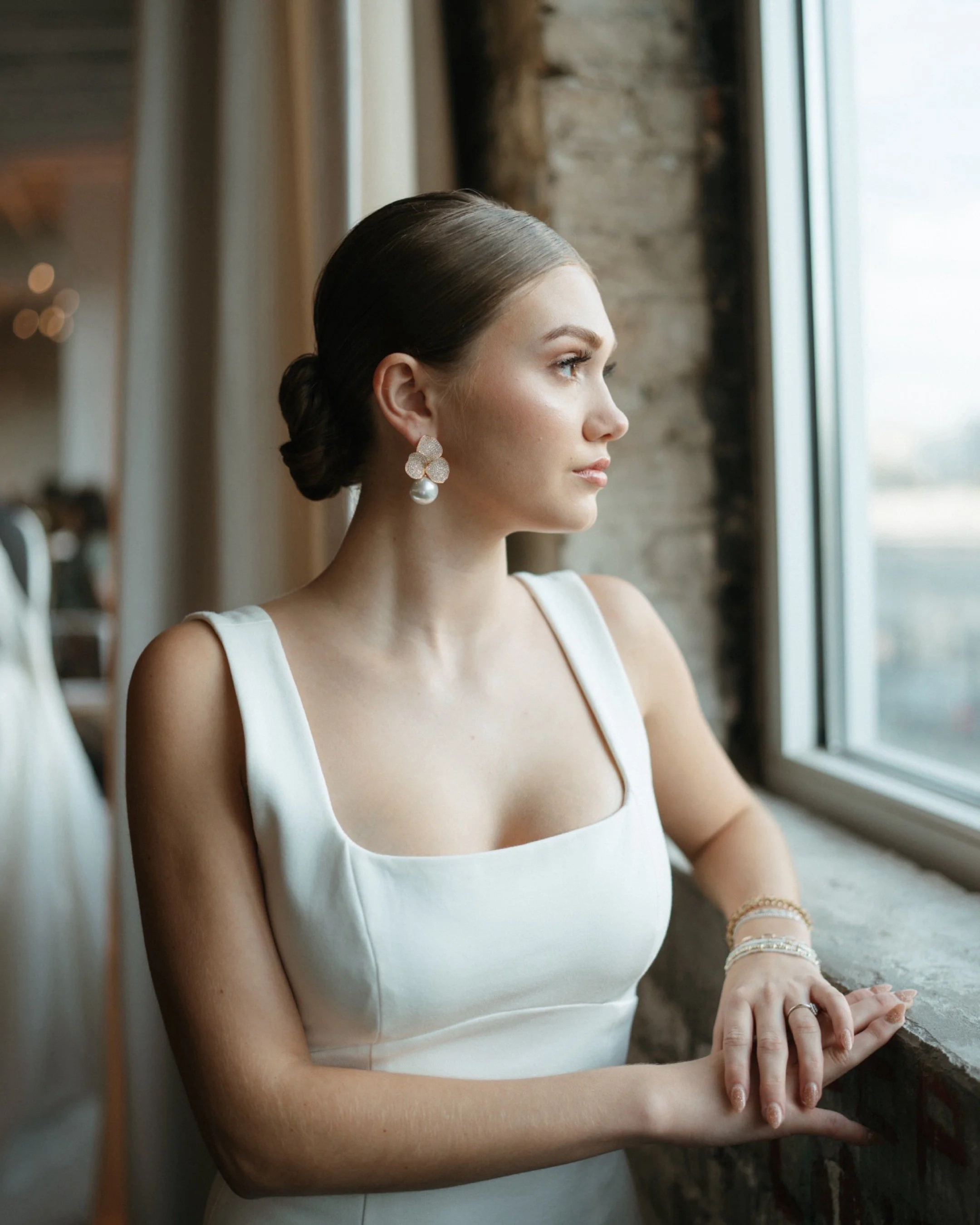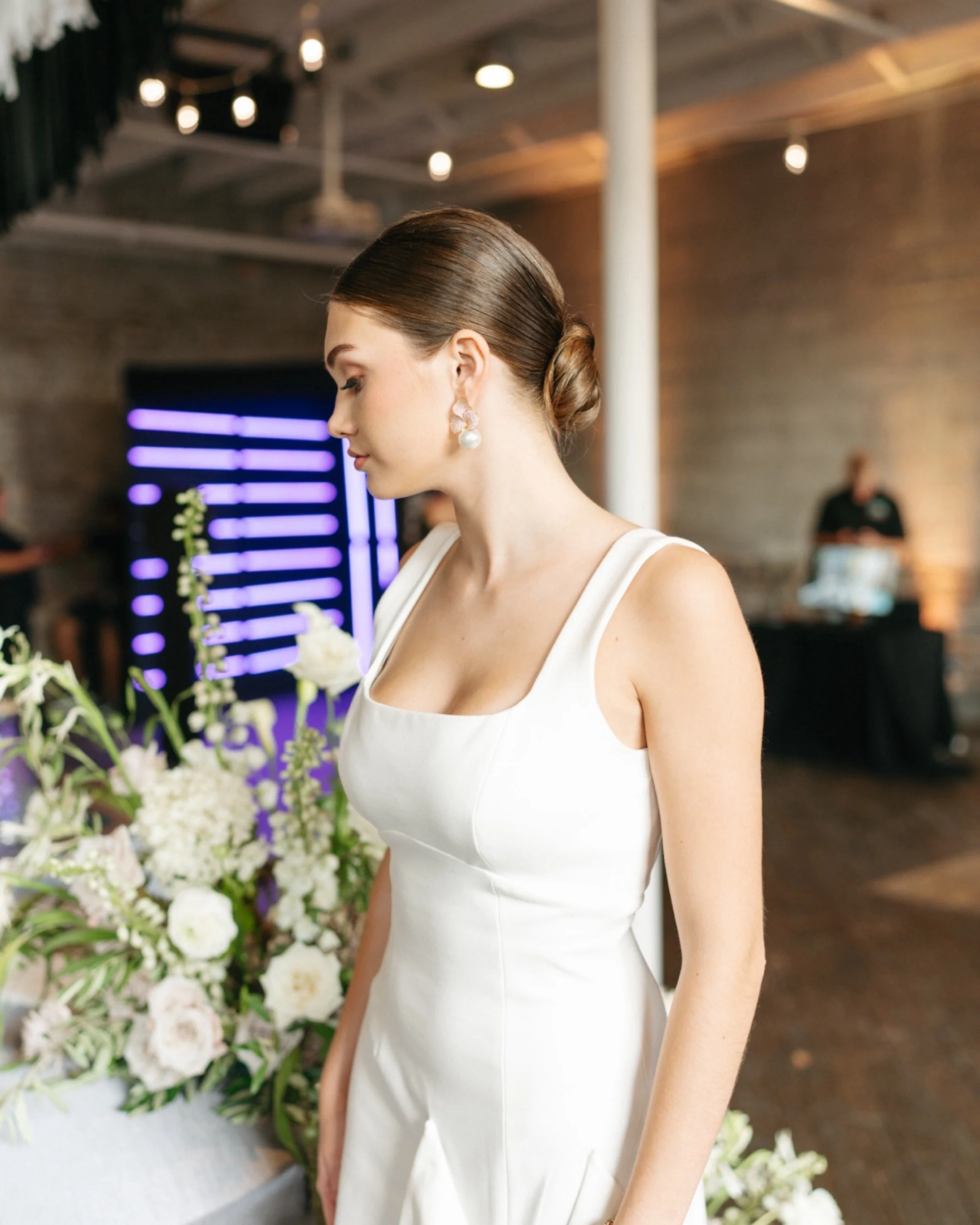 A woman in a white dress with her hair styled in a bun and wearing earrings stands near a floral arrangement in an indoor space with modern decor and string lights.