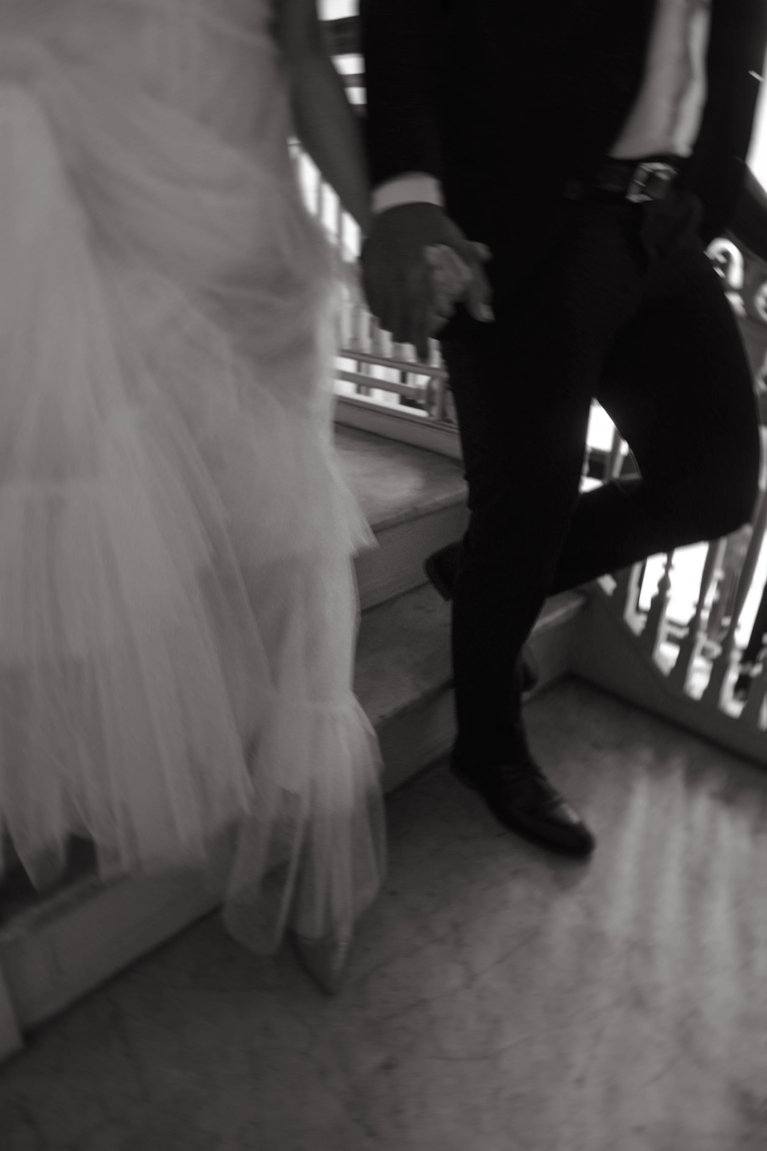 Black and white photo of a person dressed in formal attire with one leg raised on a staircase railing, holding a small object or hand in a pocket, next to a person in a wedding dress.