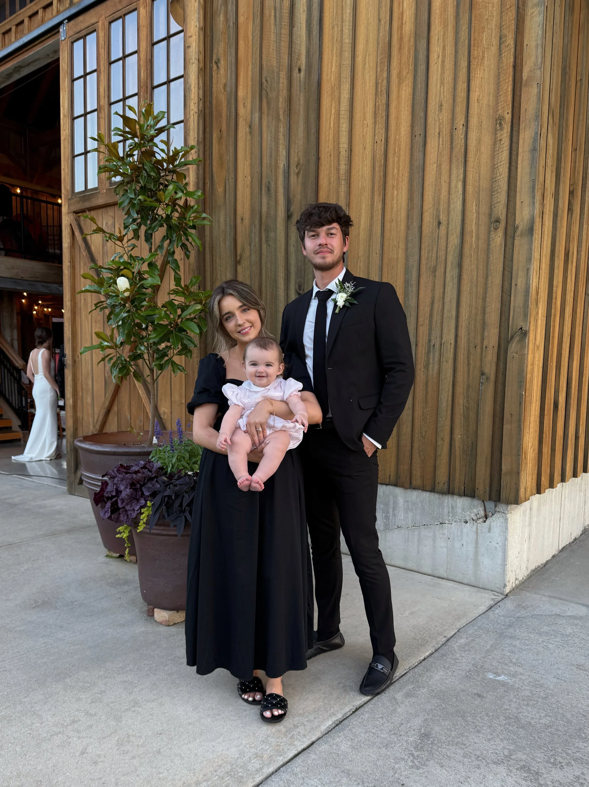 A family of three standing outside a wooden building, dressed in formal attire. The woman and man are holding a smiling baby girl dressed in white. The woman wears a black dress and the man wears a black suit with a white shirt and black tie.